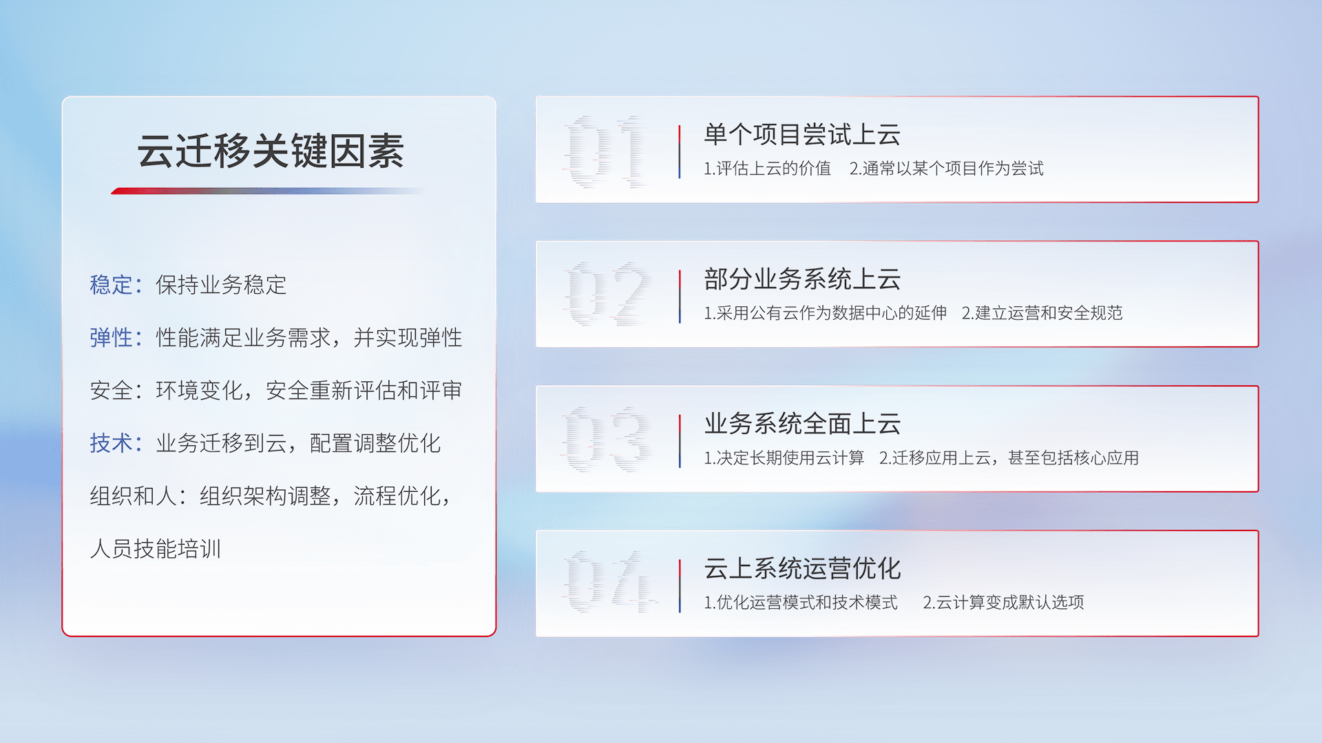 结合实际业务,,,,从规划设计、、云平台选型、、云原生改造、、数据迁移、、、、集成交付,,,迁移全过程为客户识别最佳上云路径,,做好风险识别管理,,设计网络架构、、、、身份权限、、安全审计合规、、、、操作审计、、、、日志审计、、、监控告警策略、、、、多站点容灾设计等,,,,对云上基础设施进行整体规划,,提升IT治理水平,,,,以满足弹性、、、、高可用、、、高性能的需求。。