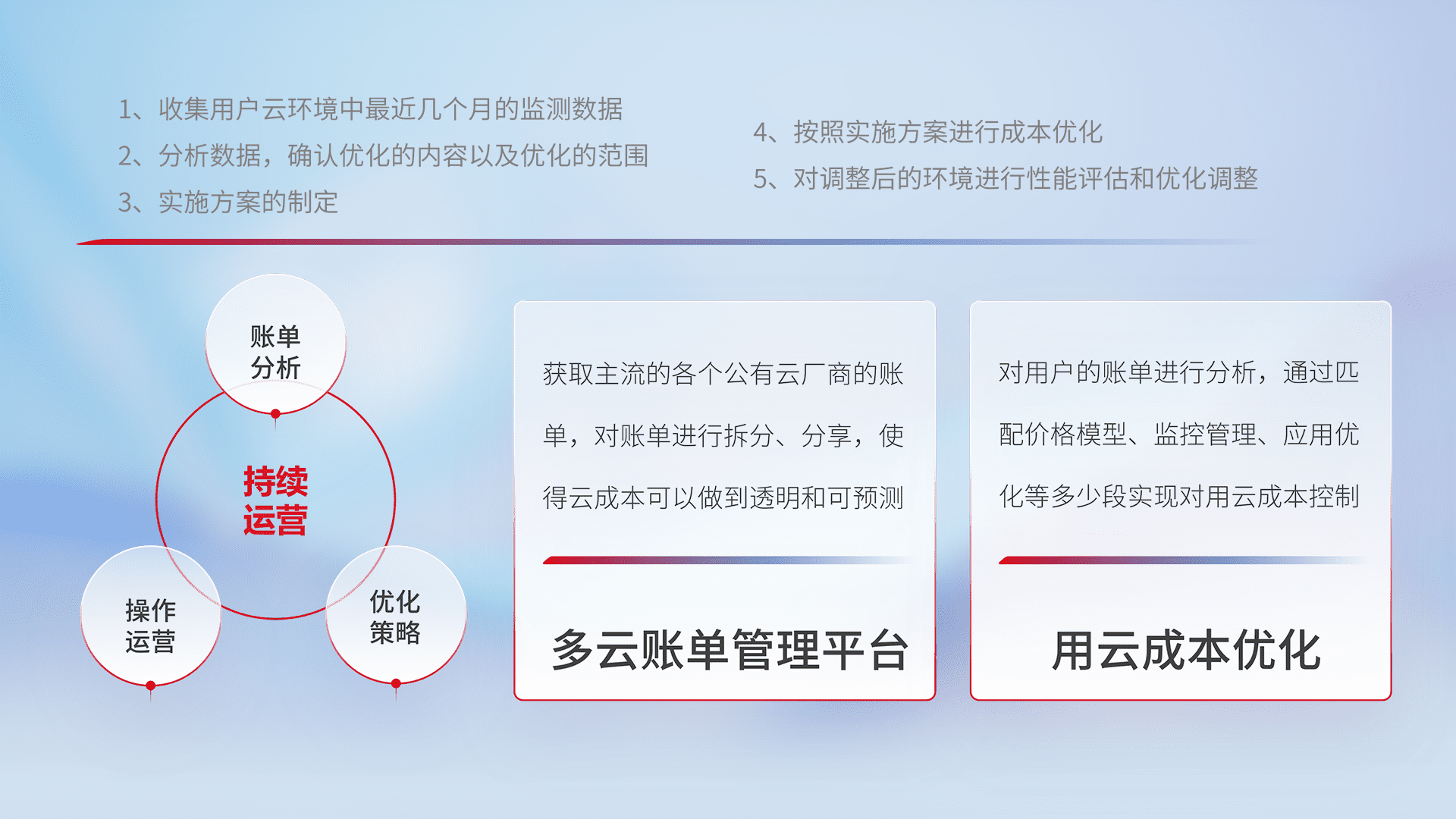 通过多云纳管,,,以统一的资源数据模型把客户的云资源进行抽象和封装,,,,进而实现对多云资源的统一操作,,,,保障云资源管理的可靠性、、稳定性与可用性。。。。量身定制化运维内容,,配置、、、、开发运维、、、补丁管理、、、、备份、、、、监控、、、、认证和访问管理、、审计和日常巡检等,,,保障在用云过程中的可靠度,,,,稳定度以及高可用率。。。。